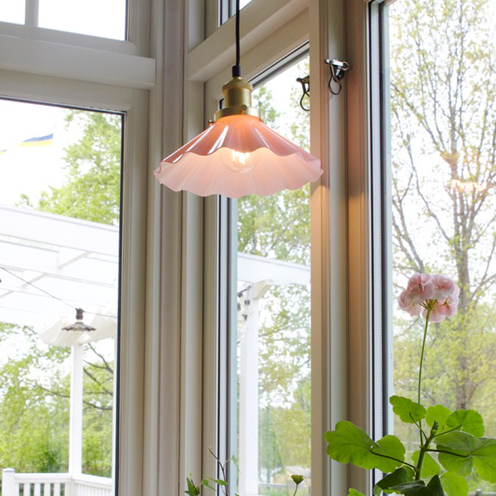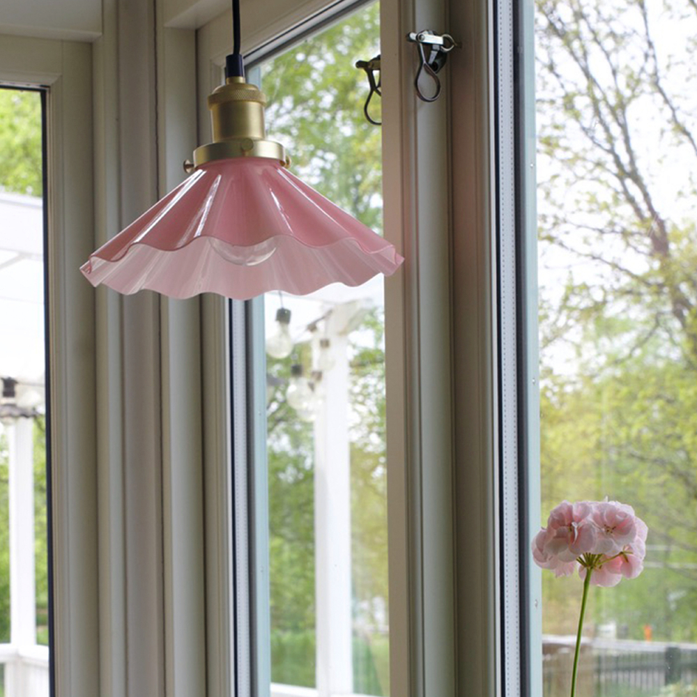 En traditionell skomakarlampa i serien August, med vågig lampskärm i rosafärgat glas och metallkupa med borstad mässingsfärg. Passar perfekt i ett fönster med djup, samt även över köksön eller till matbordet.