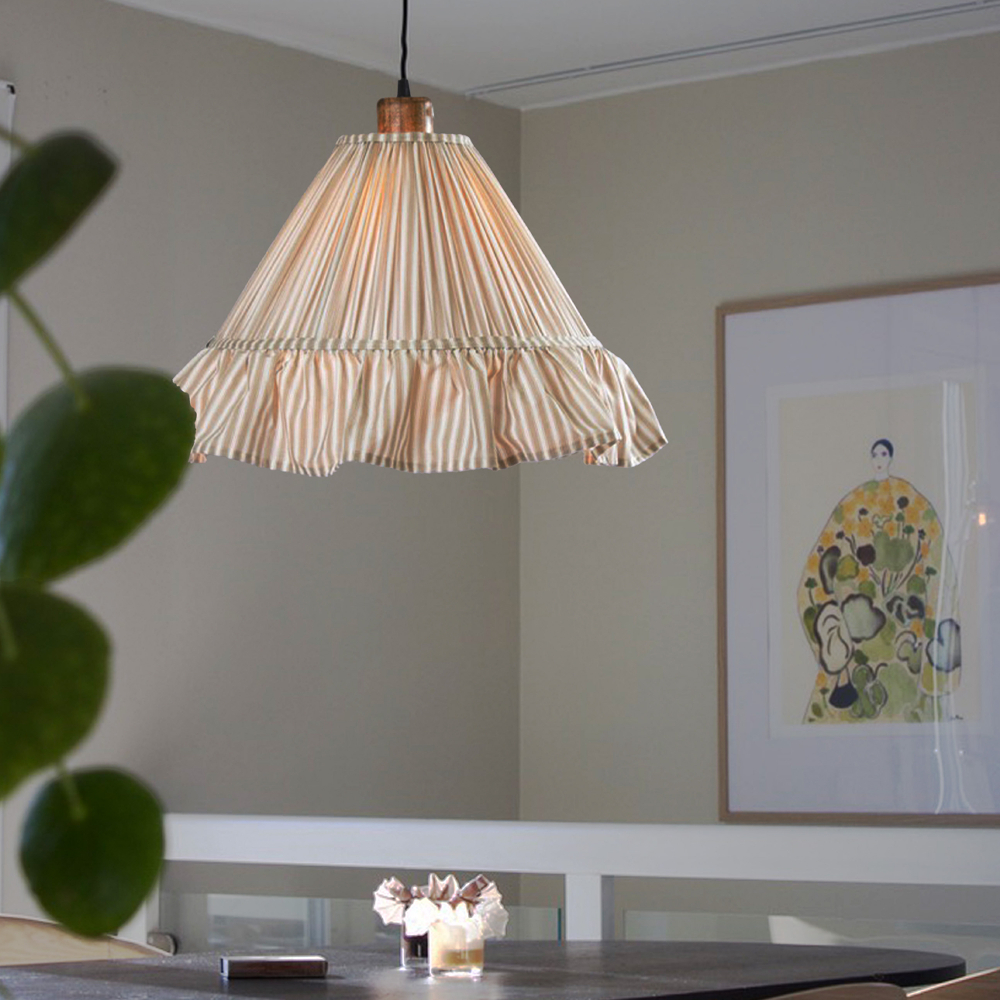 Estrid pendellampa är en lampskärm klädd i randigt tyg, med en svagt konformad siluet och en volangkant längst ned. Skärmens nedre diameter är 40 cm, den övre 13 cm, och höjden (exkl kjol) är 22 cm. Skärmen har E27-lamphållare och vi rekomenderar att använda en LED-ljuskälla, max 25W.