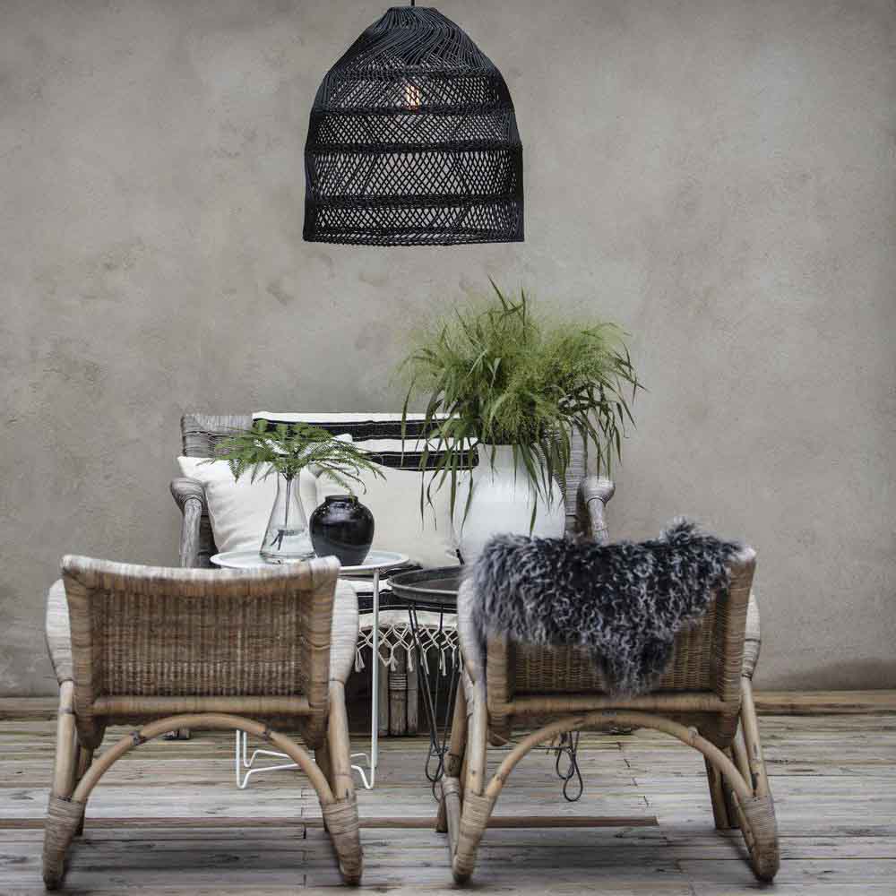 Maja takskärm i en vacker tvinnnad rotting i svart. Passar perfekt utomhus som till exempel i ett växthus, uterum eller inomhus. Lampan kommer med en vitt sladdställ som är 1,2 m och med en takkopp. Tänk på att väder och vind kan komma att påverka utseendet. Finns i flera färger och storlekar. Från Pr Home.