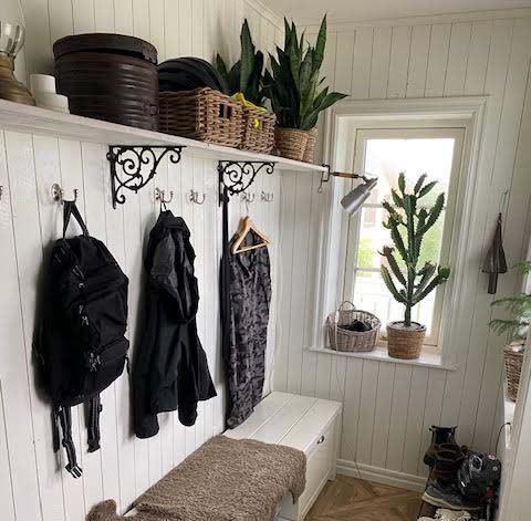 När det gäller att hålla ordning i sin hall har jag två jättebra tips! Första inredningstipset för hallen är att var sak skall ha sin plats, hundkoppel, skaffa en krok just för hundkopplet (vi har en krok som är en hundsvans som är fint till kopplet till exempel men det går bra med en snygg järnkrok) Vantar, halsdukar, mössor ha en korg för varje, eller ha en korg för varje familjemedlem där du samlar "rätt" ytterkläder. Då blir det enkelt att hitta sina kläder i hallen men även enkelt för den som städar och vill plocka undan. Korgar du kan använda för organisering av din hall kan vara naturkorg med ett handtag att hängas på en krok eller spik, eller vägghyllor som är infällbar mot väggen med smarta namnlappar på. Det andra tipset jag vill ge som jag applicerar själv är att rensa ut! När våren kommer, plocka bort alla vinterkläder. Tröjor & jackor som inte används regelbundet, ta bort dem. I din hall skall du ha det luftigt och snyggt så man hittar sin jacka snabbt & ledigt. Det är bara tröttsamt att samtidigt som man skall iväg behöva leta efter sina kläderplagg eller paraplyet. Genom att bara ha aktuella ytterkläder i hallen ser du var din favoritjacka är och kan ta den under armen & sticka iväg! Även nycklar är supersmart att ha en skål till, en kroklist eller liknande, då är det enkelt att veta vart nycklar hör hemma + vart de är.