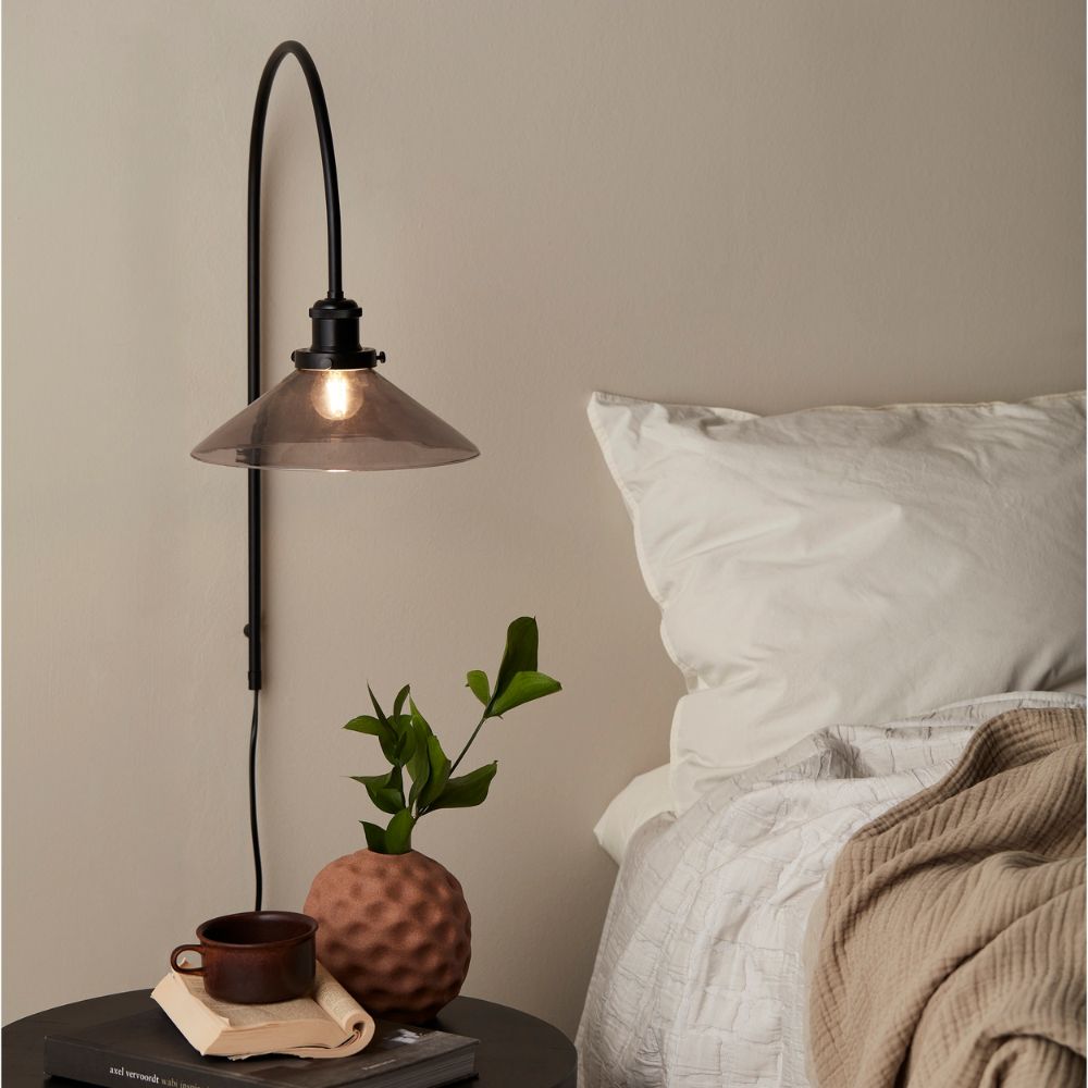 Vägglampan August kombinerar en stilren svart metallram med en elegant glasskärm. Glasskärmen har en svart finish och är fäst i en lamphållare av svartborstad metall. Lampan monteras enkelt på väggen med ett snyggt och diskret fäste.