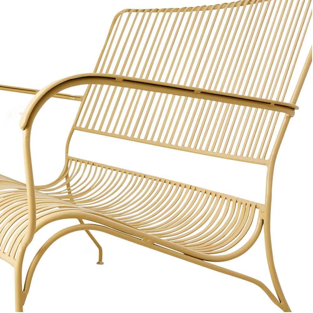 Soffan är tillverkad i pulverlackerat järn. För att den ska hålla sig fin så länge som möjligt rekommenderar vi att den förvaras torrt under vinterhalvåret. Som med alla järnmöbler kan en vacker patina uppstå med tiden om de utsätts för fukt, vilket bara förstärker den genuina industriella känslan.