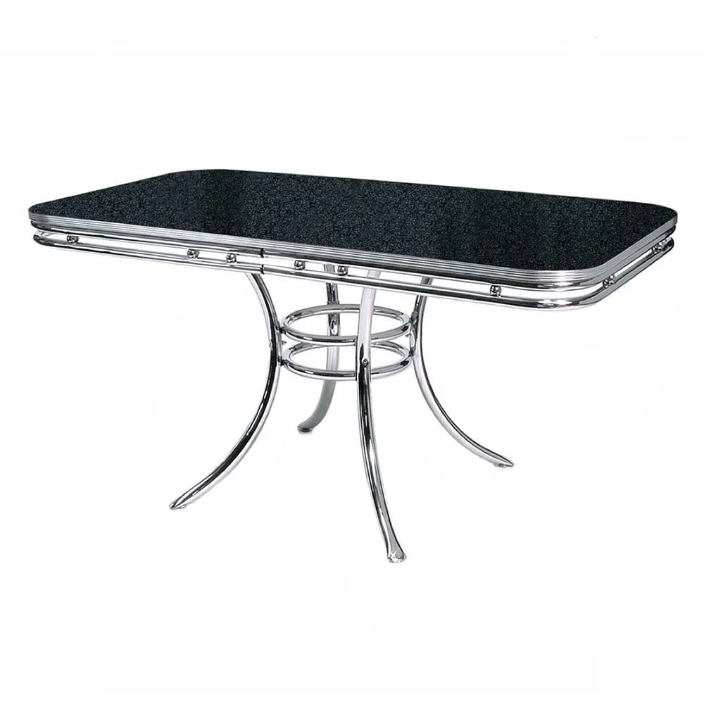 Retro dinerbord i toppkvalitet som passar lika bra i hemmet som i en restaurang. Toppskivan på dinerbordet finns i två olika färger. Det finns plats för två stolar på vardera långsida. Det kromade underredet ger den rätta 50-tals stilen. Matcha bordet med våra dinerstolar för att skapa ditt egna diner hemma!