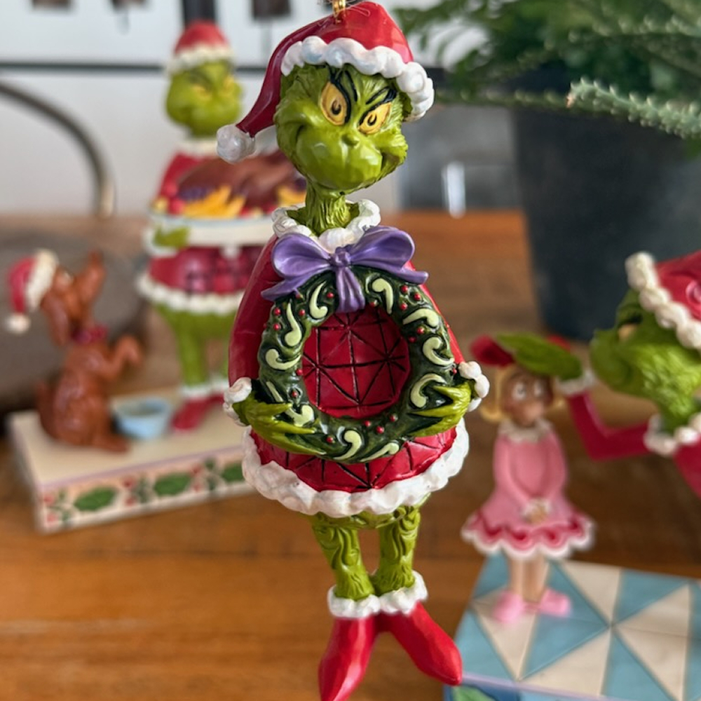 Busig och grön, den enda söta aspekten av Grinchen är hans leende. Den här julgransdekorationen av Jim Shore föreställer Grinchen som håller en julkrans med huvudet lurigt på sned... Kommer han att stjäla hela julen? Han är noga med att vara tyst och trippa på tå runt ditt träd ifall han blir tagen på bar gärning. Jim Shores omisskännliga stil framkallar en känsla av nostalgi med traditionella teman. Grinchen är vackert handmålad och tillverkad av högkvalitativt stenharts med fokus på detaljer och kan därför vara lite olika, och tillverkas endast under en kort period, vilket gör figurerna mer speciella. Just denna får vi bara ett par exemplar av! Har hänge för upphängning i gran. Superfin i verkligheten.