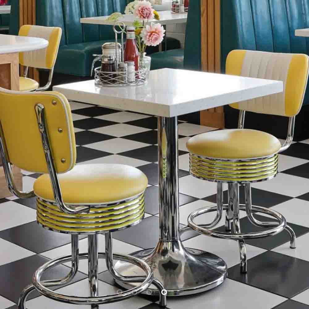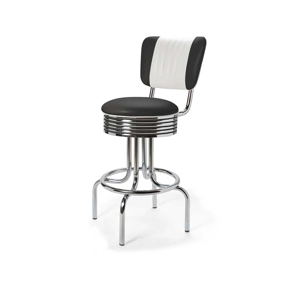 Snygg barstol i mellanhöjd för dig som vill ha en barstol mot en köksbänk (ca 90 cm hög) som passar lika bra i hemmet som i en restaurang. Barstolen har vadderad sits som med det kromade underredet ger den rätta 50-tals looken som man blir glad av att titta på. Den finns med och utan rygg. Ställer du stolar på rad rekommenderas 60 cm från center-center på stolarna.