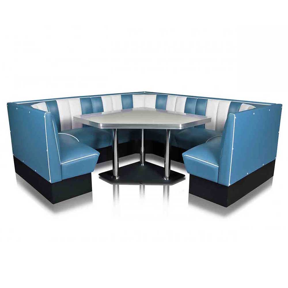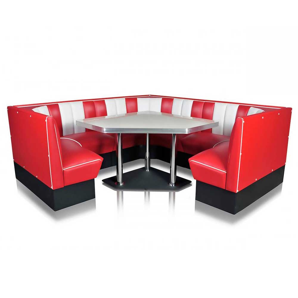 Med detta diner booth kan du verkligen skapa dig en fantastisk miljö i amerikansk retrostil. Materialet är i restaurangkvalité som håller i många år framöver och kommer göra rummet välkomnande. Detta sett är ett komplett dinerbås som består av en hörnformad soffa och ett matchande specialformat dinerbord.