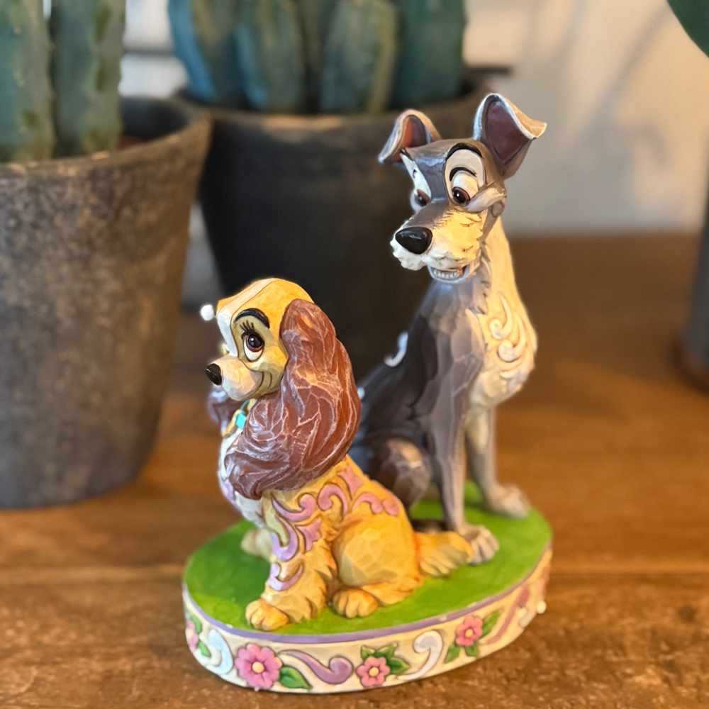 Visst tänker man på en skål med spagetti och köttbullar när man ser Lady och Lufsen? Denna Disney figur av Lady och Lufsen har en flört i luften & heter "Opposites attract", motsatsen attraherar. En vacker Disney figur designad av Jim Shore. Jim Shore är en av de få personer som har obegränsat licens till Disney. Alla Disneyfigurer är handmålade och tillverkas endast under en kort period, vilket gör figurerna mer speciella.