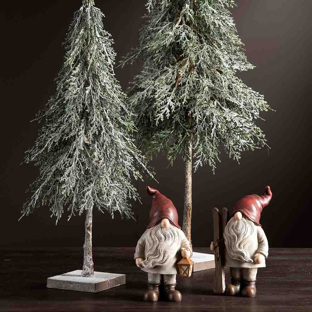 Set med en tomte som håller ett par skidor och en tomte som bär en lykta. Perfekt som en lekfull juldekoration på en låda eller kanten av en hylla eller fönsterbräda. Tillverkad av poly.