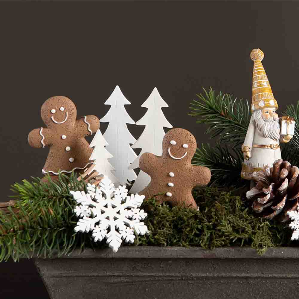 Skapa ett blomsterarrangemang med julkänsla med två små pepparkakor. Tillverkade i poly Vad vore julen utan massor av julpynt som smyckar så gott i juletider? Dessa är två fina pepparkakor sitter på pinne med vitt dekoration som så skall vara. Sätt den i din julgrupp, julkrans eller julpynt. Kombinera dem gärna med andra tomtar som vi har i sortimentet och skapa mer liv och effekt i ditt julpynt. Man kan aldrig ha för många tomtar tycker vi på Magasin 11! Säljes i 2 pack.