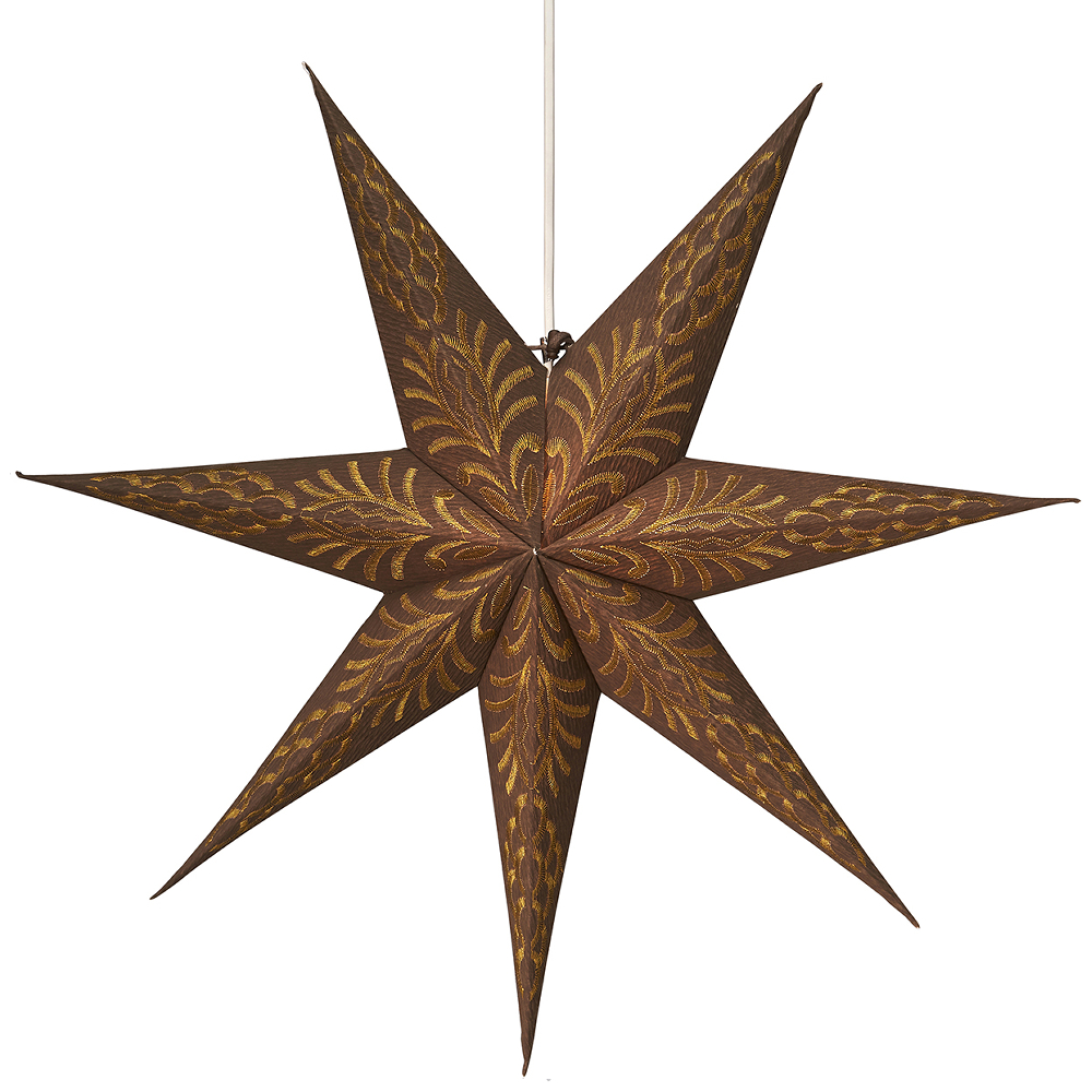 Celeste julstjärna i brun guld, skapad med något kraftigare kvalitet papper med brodyr i kontrastfärg. Stjärnan stängs med hjälp av remmar och band.