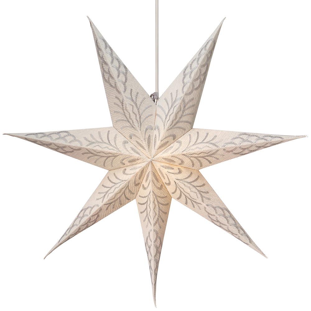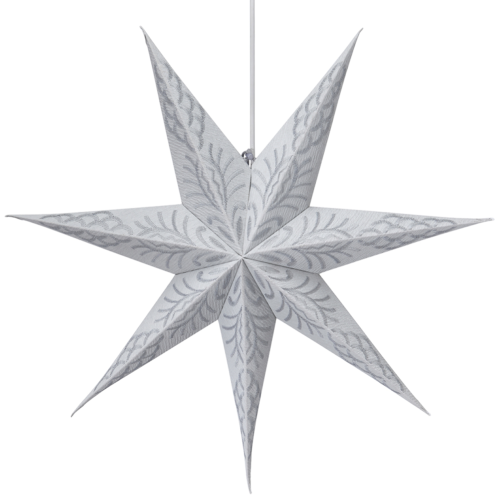 Celeste julstjärna i silver grå, skapad med något kraftigare kvalitet papper med brodyr i kontrastfärg. Stjärnan stängs med hjälp av remmar och band.