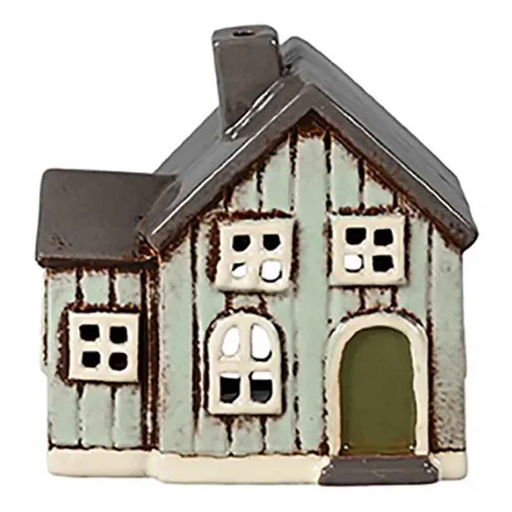 Vackert danskt keramikhus för värmeljus i blåaktig färg med grått tak att ha på en hylla eller fönsterbräda. Fint gå bort gåva eller varför inte present till dig själv? Vacker även då den inte är tänd, supermysig att ha ett ledljus eller värmeljus i om kvällarna. Vacker att kombinera med våra andra keramikhus för värmeljus. Just detta är väldigt vackert med ett målat träd på sidan.