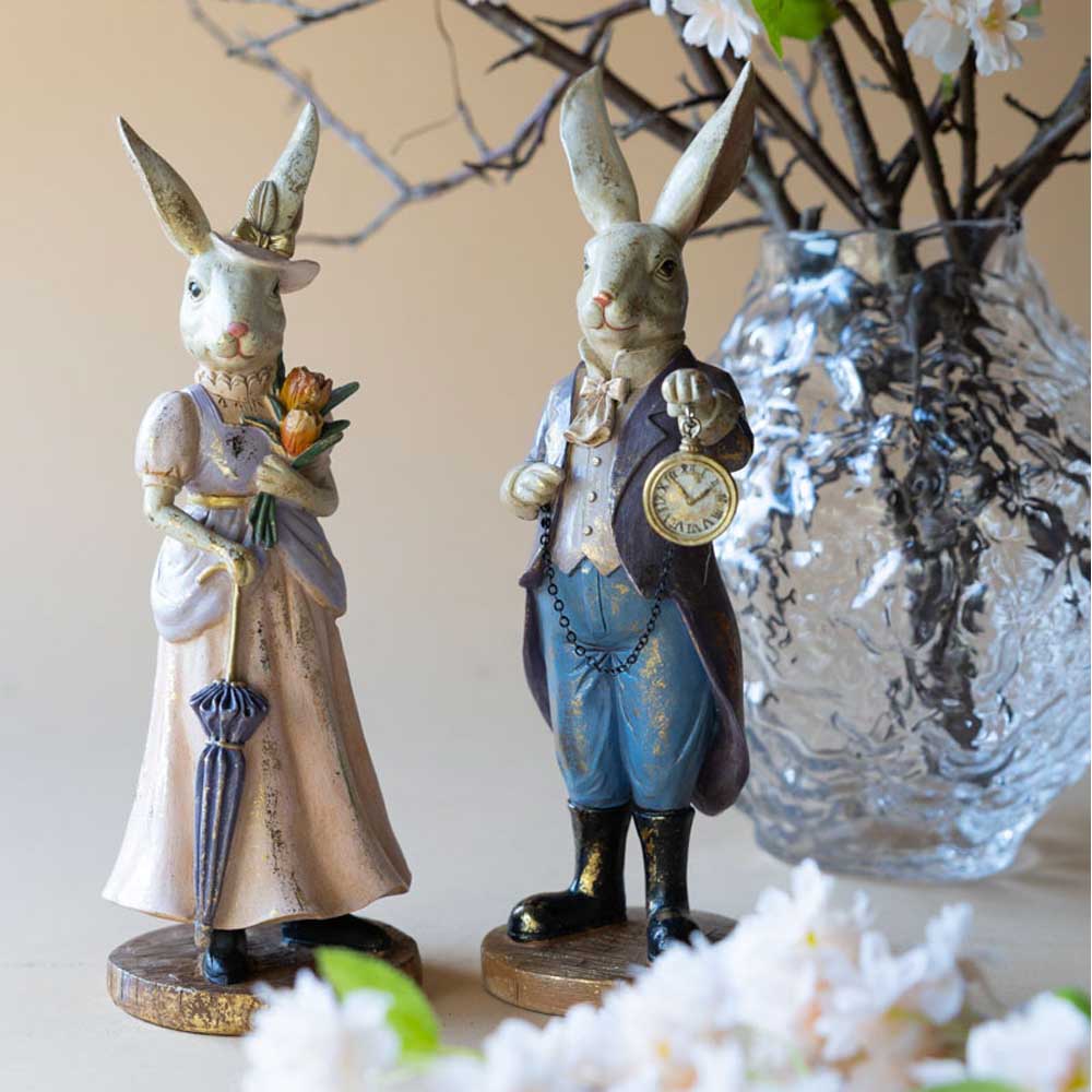 Välklädda kaniner som håller ett paraply och ett fickur. Perfekt som dekoration i fönstret eller på soffbordet. Tillverkade i poly.. Fina att mixa & matcha med & supergulliga påskpresenter!