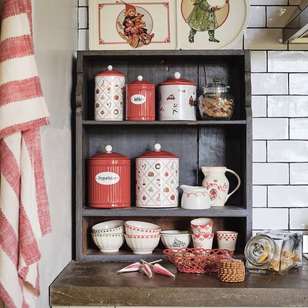Plåtburk med nostalgiskt julmotiv. Finns i två storlekar. Använd burken till pepparkakor, småkakor, julgodis eller annat gott. Lock i rött med en rund vit knopp. Silikonring som gör att locket sitter stadigt och sluter tätt.