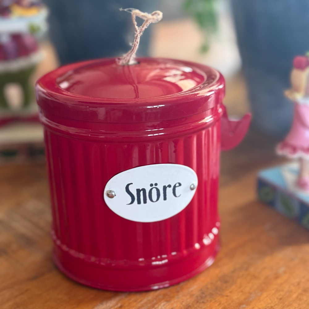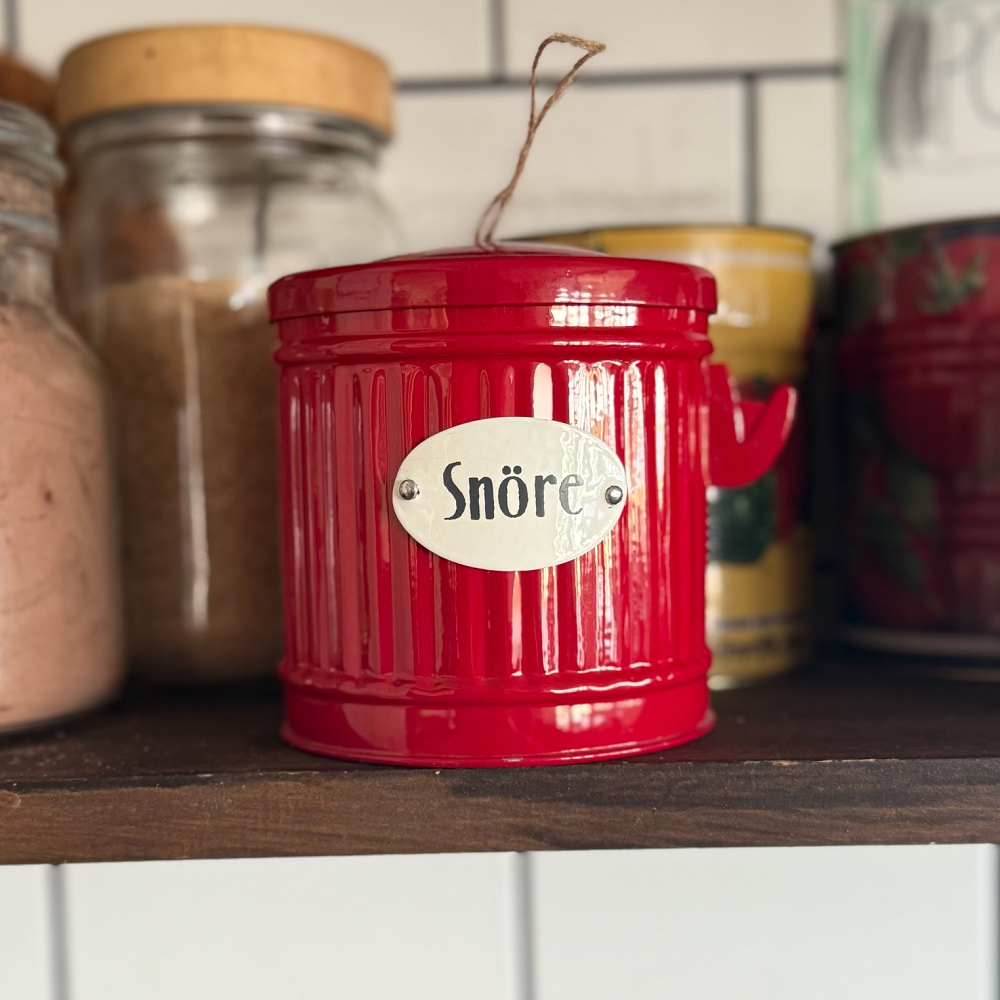 Plåtburk Hugo Snöre är en söt liten praktisk plåtburk i en vacker röd färg och texten "Snöre" på framsidan. Perfekt för förvaring med charm och funktionalitet. Placera den där du ofta behöver snöre, så har du det alltid nära till hands. Med sin sköna retrokänsla fungerar den både som en funktionell förvaringslösning och en snygg inredningsdetalj.