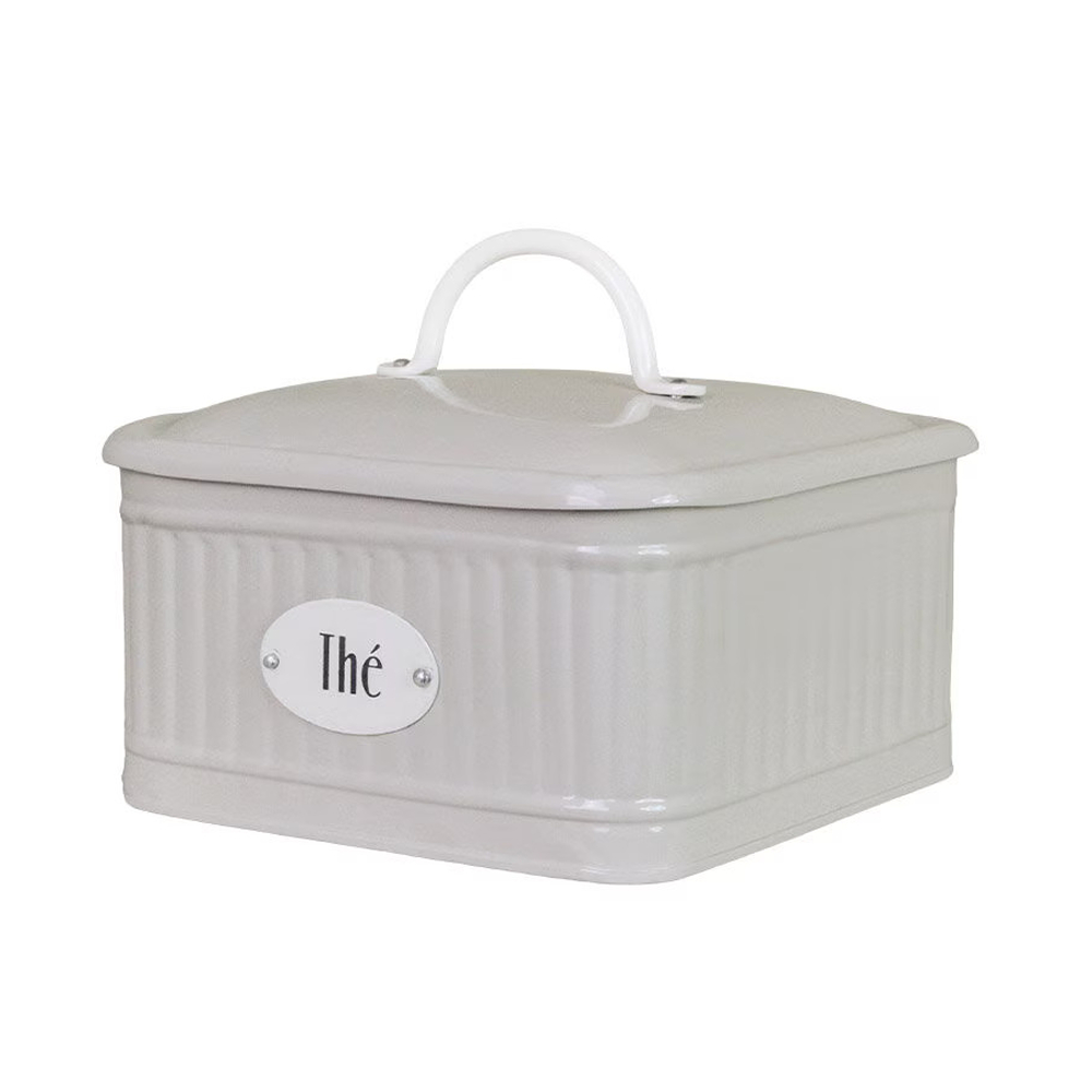 Kvadratisk beige teburk med lock och texten "Thé" på framsidan. Utrustad med smarta fack för enkel organisering av olika sorters Thé. Perfekt för förvaring med charm och funktionalitet. Denna sortens plåtburk kommer även som kaffeburk, tvättmedelsburk, kakburk & plåtburk i retrostil för knäckemacka i matchande stil. Teburken i retrostil är handgjord och handmålad vilket innebär att vissa olikheter och ojämnheter kan förekomma.