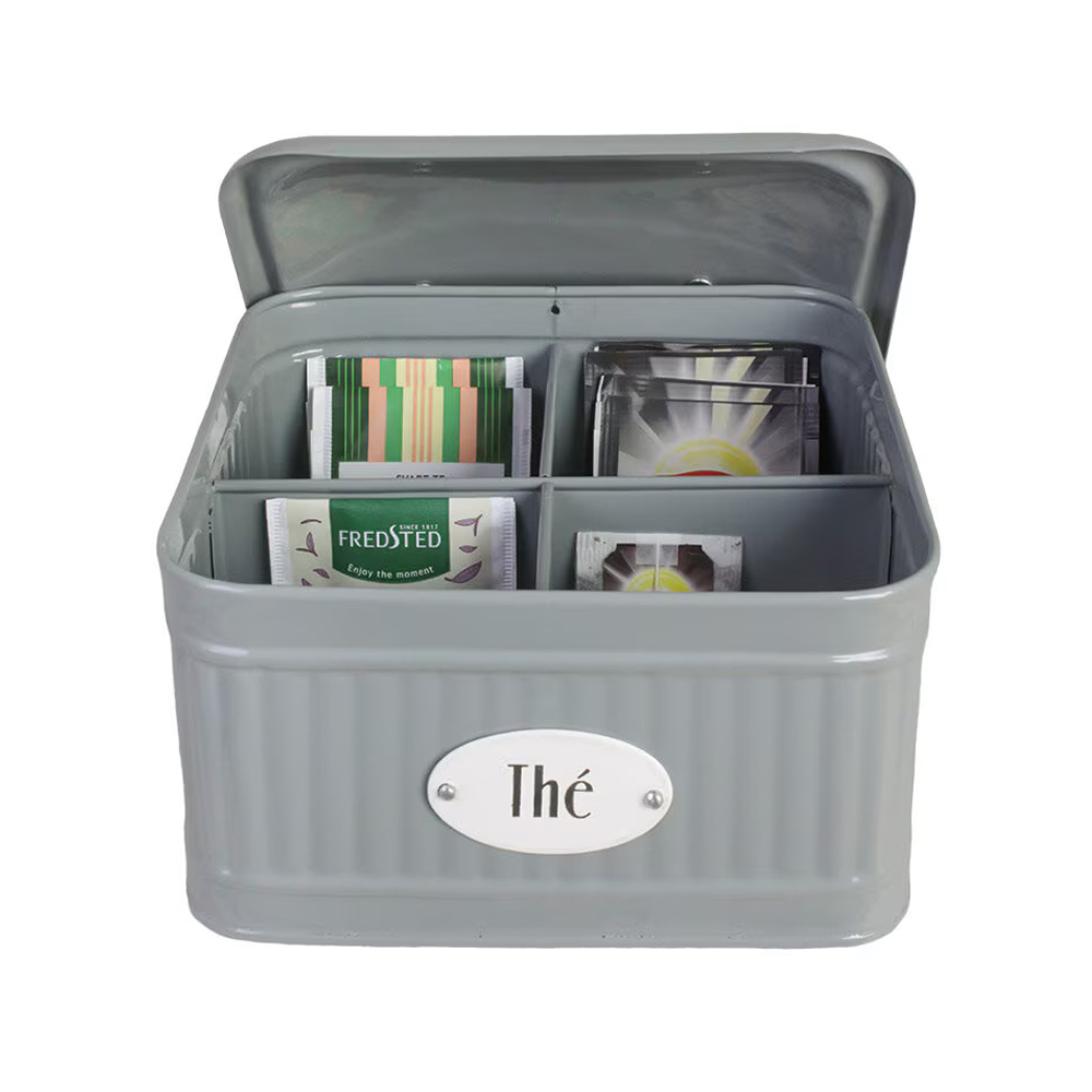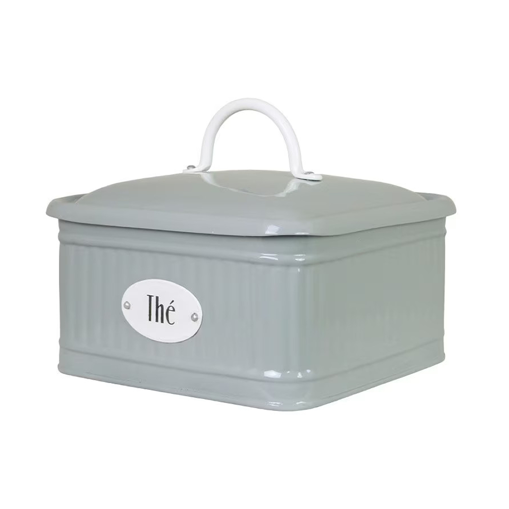 Kvadratisk grön teburk med lock och texten "Thé" på framsidan. Utrustad med smarta fack för enkel organisering av olika sorters Thé. Perfekt för förvaring med charm och funktionalitet. Denna sortens plåtburk kommer även som kaffeburk, tvättmedelsburk, kakburk & plåtburk i retrostil för knäckemacka i matchande stil. Teburken i retrostil är handgjord och handmålad vilket innebär att vissa olikheter och ojämnheter kan förekomma.