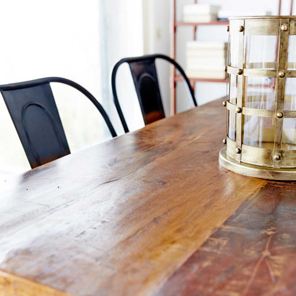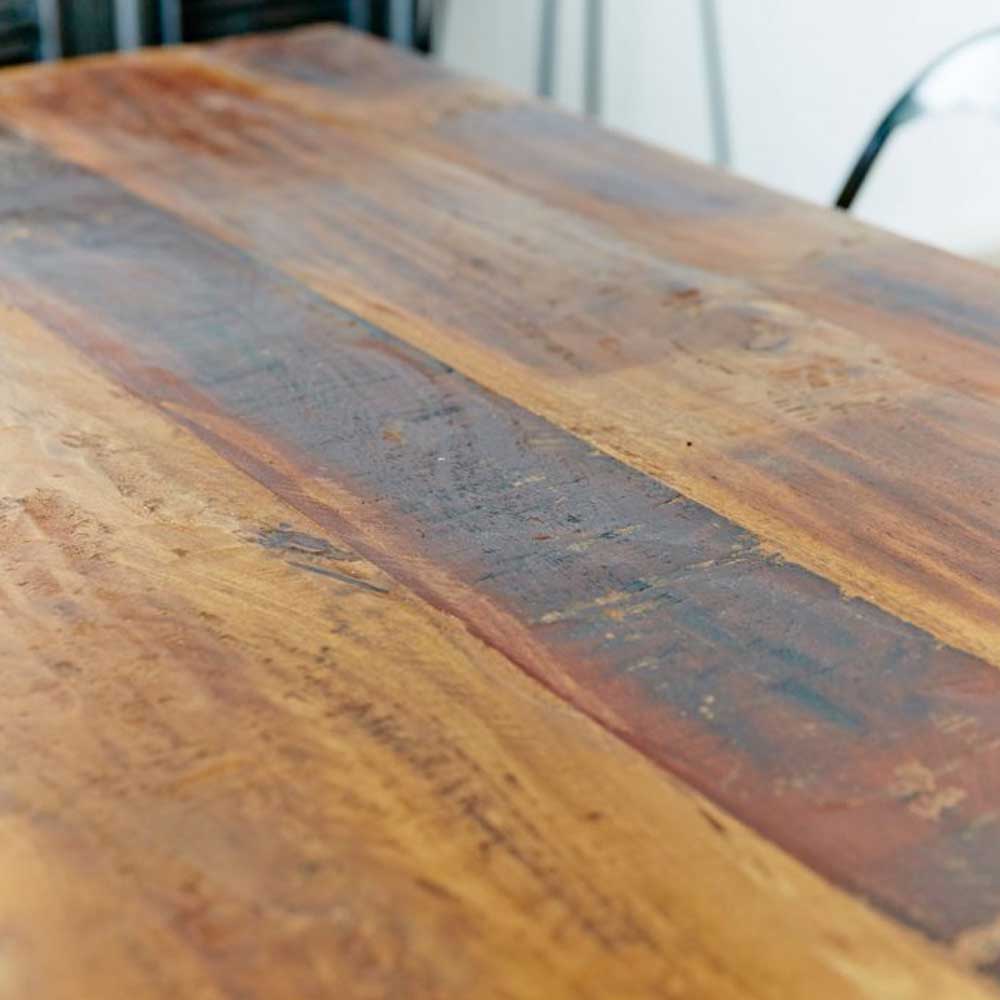 För dig som söker en perfekt förening av miljömedvetenhet och robust design är vårt matbord med återvunnen träskiva och gjutjärnsunderrede det ultimata valet! Bordet är skapat för att införa en unik och hållbar atmosfär i ditt hem och kombinationen av återvunnet trä och gjutjärn skapar en kontrast som är både visuellt tilltalande och väldigt funktionell. Bordsskivan på matbordet är tillverkat av noggrant utvalt återvunnet trä, vilket ger varje bord en egen unik historia och karaktär. Varje träplanka har en unik patina och textur, vilket ger en rustik och autentisk känsla till matbordet. Detta återvunna trä är inte bara vackert utan också lätt att underhålla. Med enkel behandling bevarar man bordets naturliga skönhet, och träet blir bara vackrare med tiden när det får utveckla sin patina. Underredet är gjort av högkvalitativt gjutjärn som ger en solid och pålitlig bas för bordet samtidigt som det lägger till en industriell touch till designen. Underredet är mycket praktiskt eftersom benen sitter mitt under skivan som gör att man aldrig störs av bordsbenen vilket gör detta bord extra populärt.