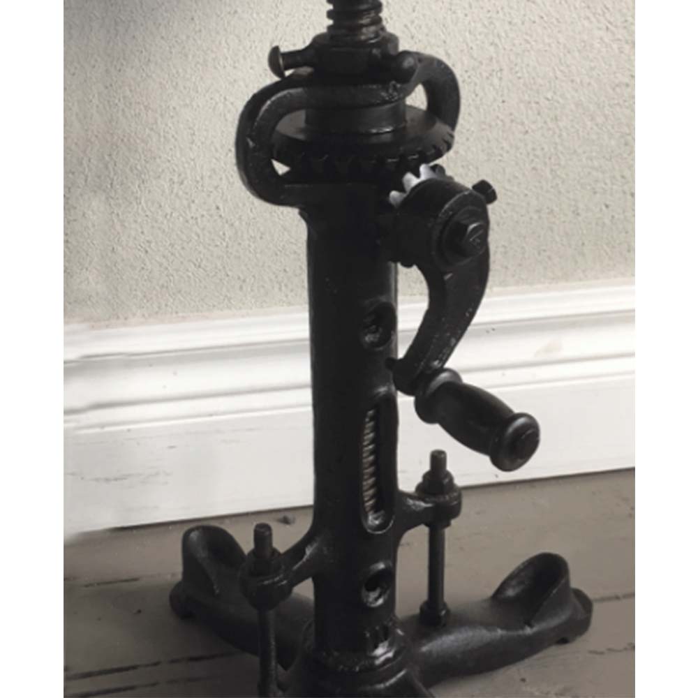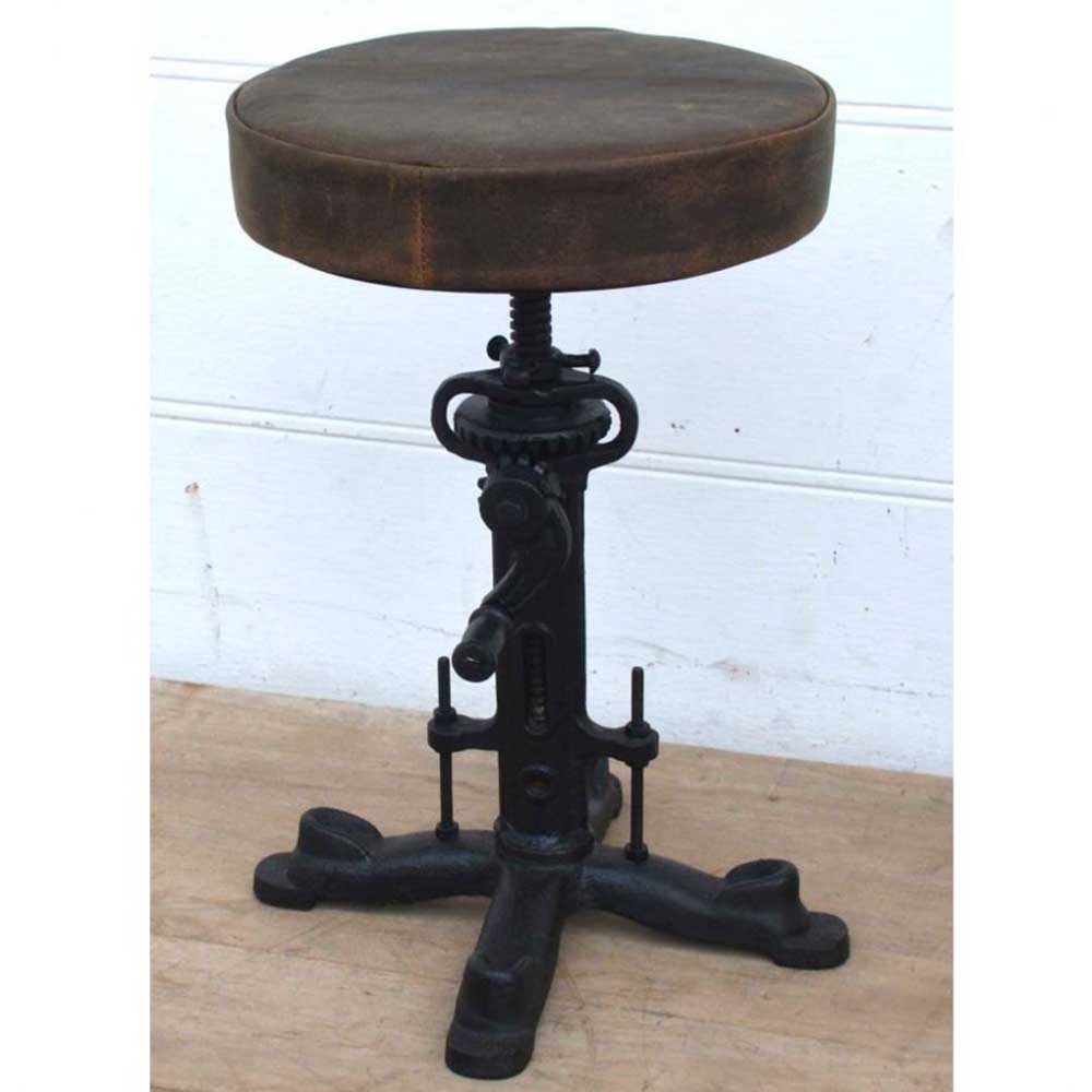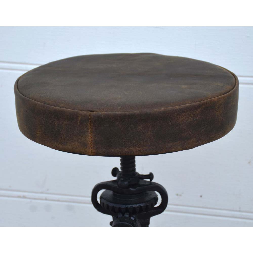 Pall av metall i industriell stil med lädersits och underrede av gjutjärn - Går enkelt att höja och sänka med veven. Den höj och sänkbara pallen levereras färdigmonterad och förpackad i kartong Skickas till utlämningsställe. Eftersom sitsen är av läder är varje sits unik, med olika färgsättning. Lädersitsen är tillverkad av koläder med stoppning av återvunnen bomull.