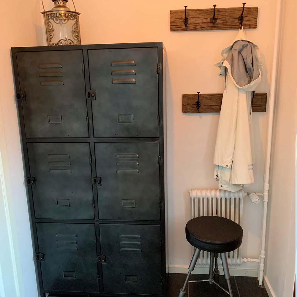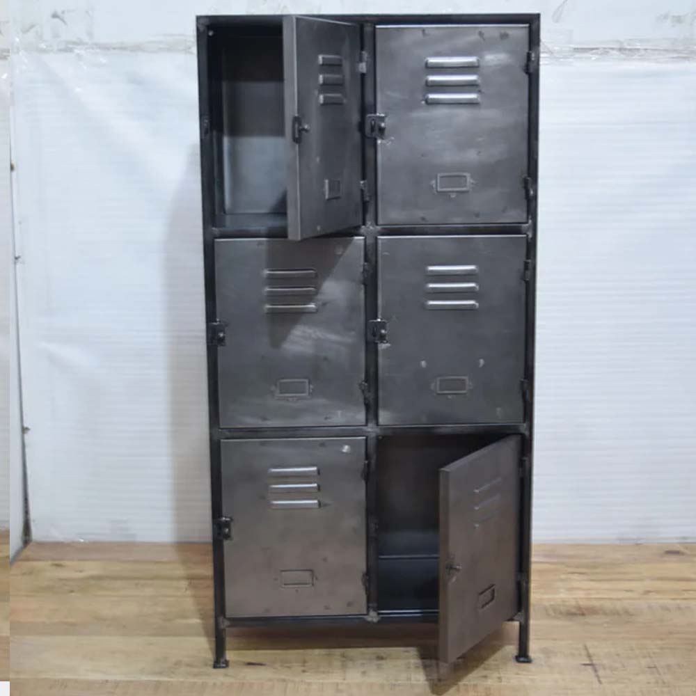 Gediget plåtskåp med sex skåpsluckor. Perfekt för förvaring i en hall, i ett kontor eller i sovrummet. Metallskåpet är tillverkat av plåt i en ruffig stil och det har flera praktiska luckor för förvaring. Finns i flera olika varianter med olika mängd luckor och mått.