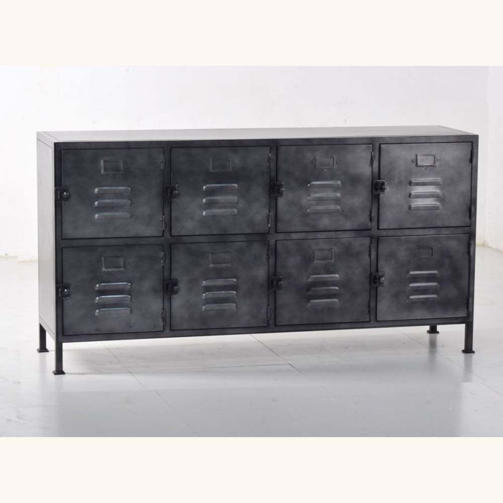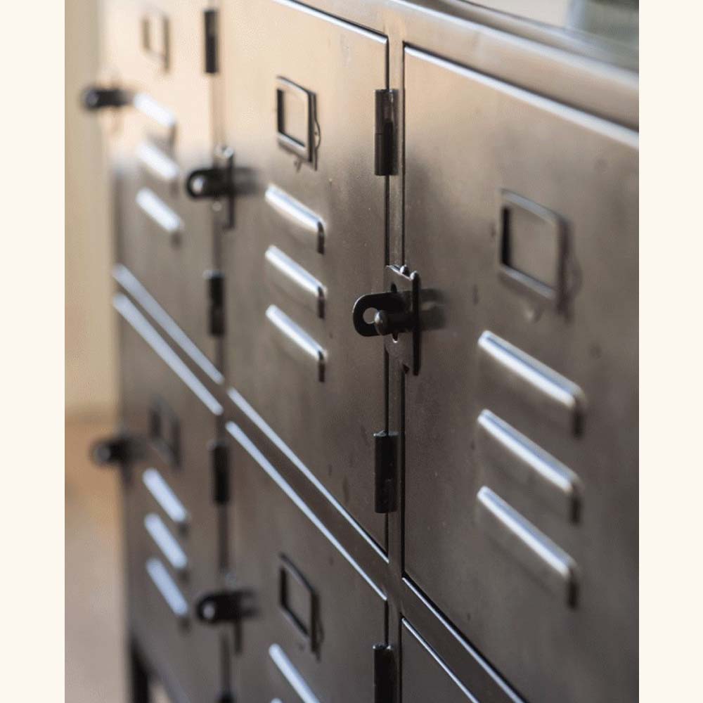 Gediget plåtskåp med åtta skåpsluckor. Metallskåpet är tillverkat av plåt i en ruffig stil och det har 8 praktiskt luckor för förvaring.