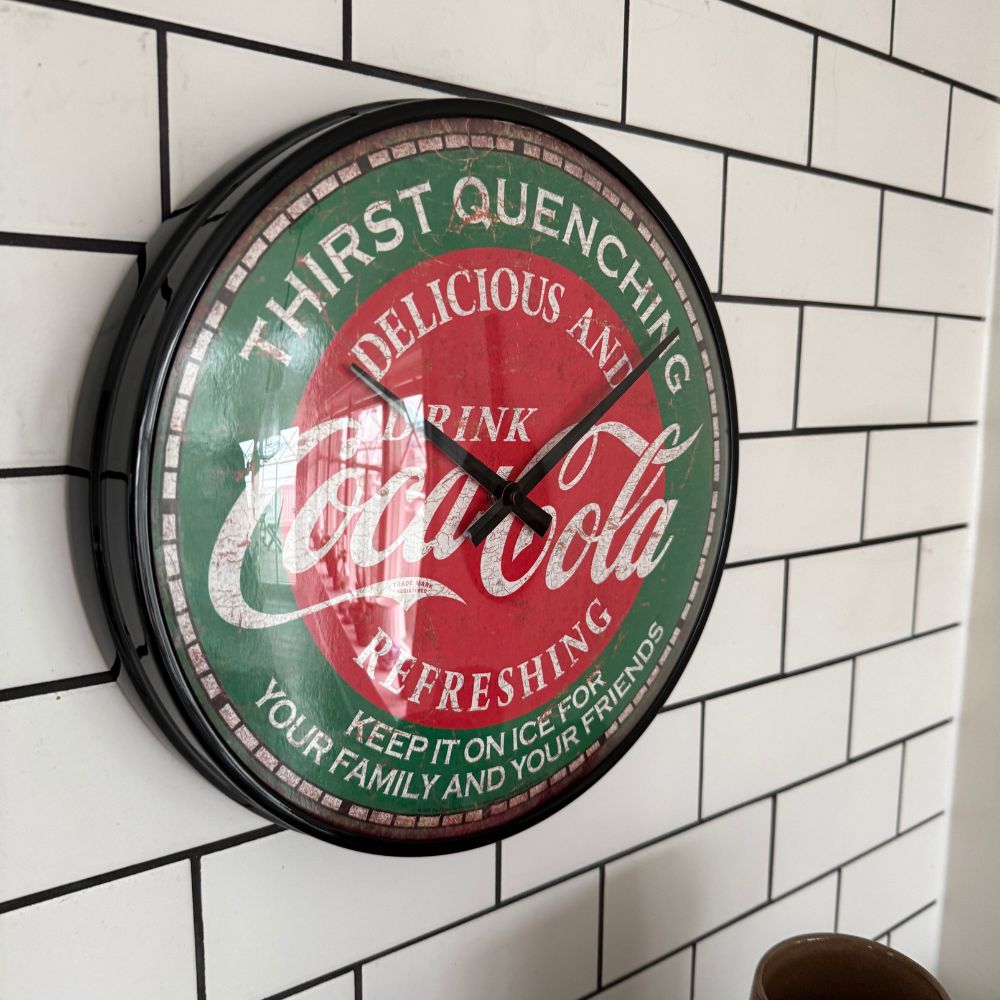 Den här Coca Cola väggklockan sprider både färg och en retrokänsla hemma. Perfekt för köksplatsen, hemmabaren, men passar i de flesta rum med Coca Cola´s logga & texten:  Thirst Quenching