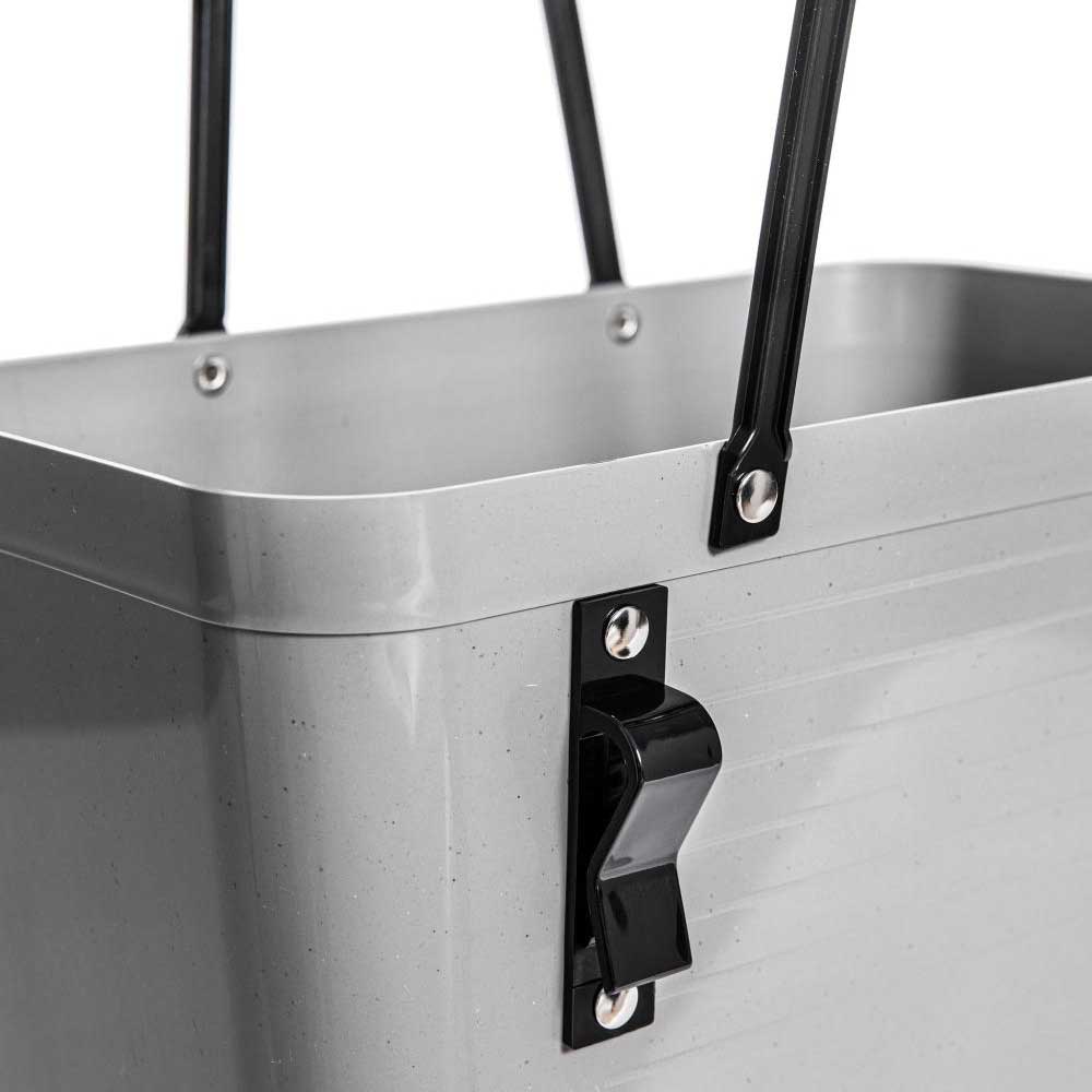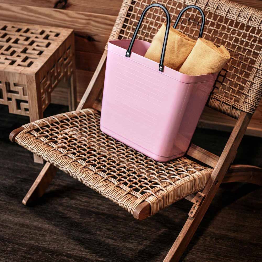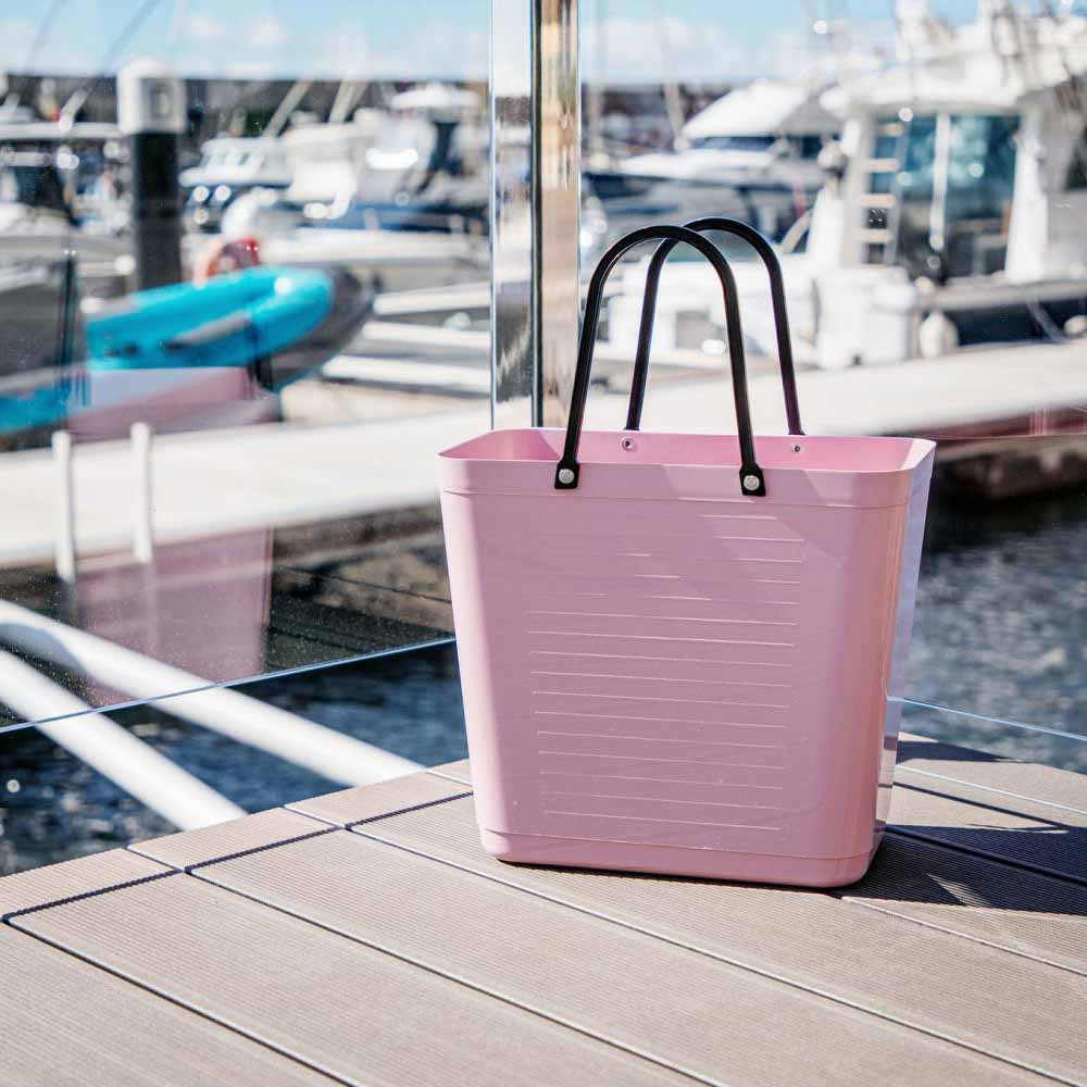 Det här är en fantastisk väska, en högre något hårdare modell av den klassiska Hinzaväskan som designades på 1950-talet. Den är perfekt bland annat som shoppingväska, strandväska, picknickkorg och till förvaring, gjord av återvunnen plast. Plasten i väskan kommer från insamlad plast i olika färger. När plasten mixas får vi en varierad grå färg med spår av svarta korn. Genom att återanvända plast spar vi energi och jordens resurser samtidigt som vi undviker onödiga koldioxidutsläpp. Handtagen är av bioplast från sockerrör som är en förnyelsebar råvara. Hinzaväskan är tillverkad i Sverige.