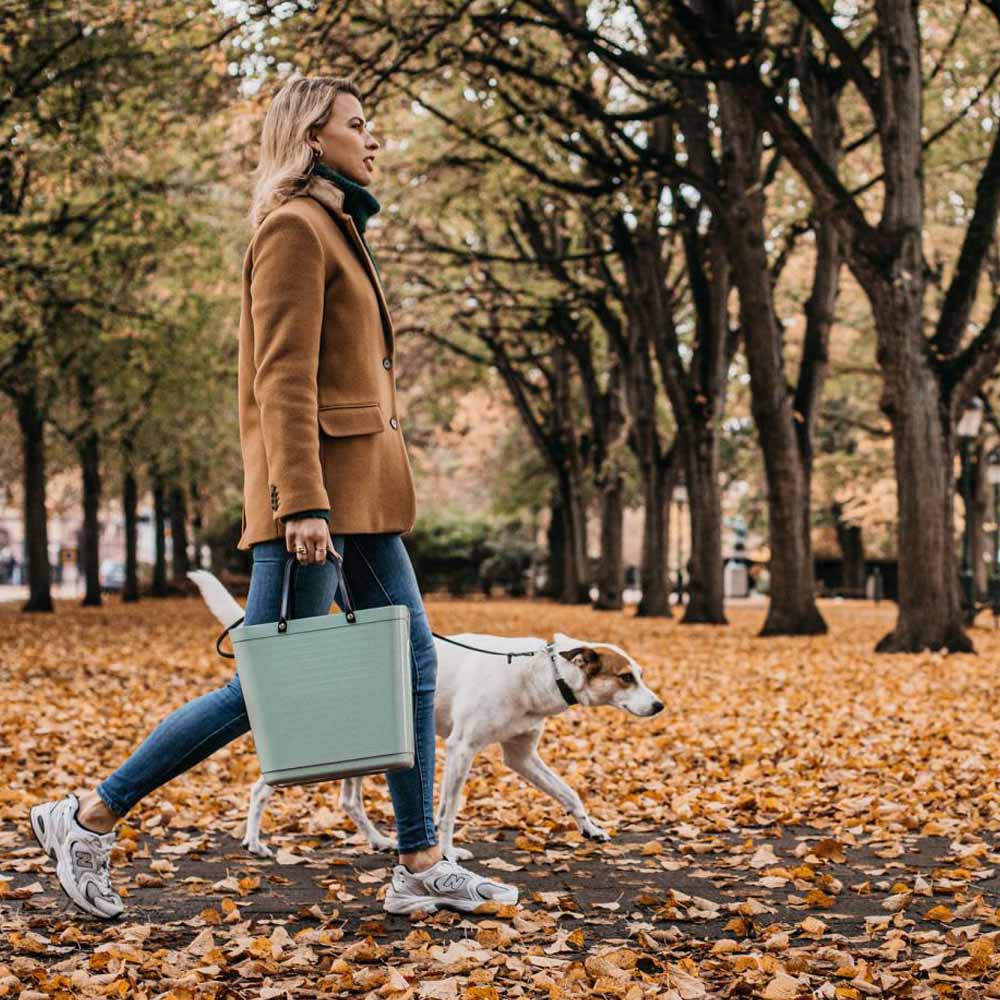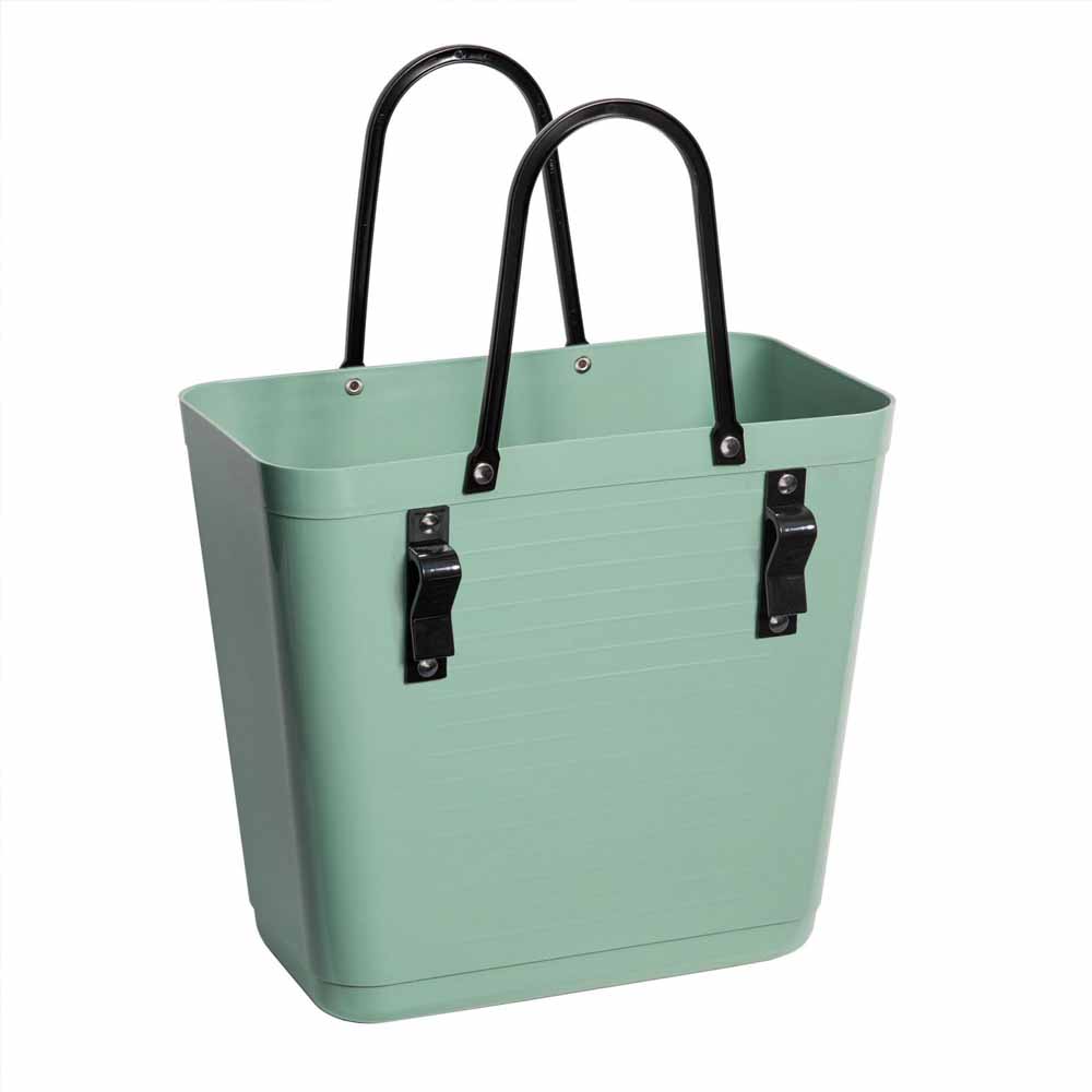 Det här är en fantastisk väska, en högre något hårdare modell av den klassiska Hinzaväskan som designades på 1950-talet. Den är perfekt bland annat som shoppingväska, strandväska, picknickkorg och till förvaring, gjord av återvunnen plast. Plasten i väskan kommer från insamlad plast i olika färger. När plasten mixas får vi en varierad grå färg med spår av svarta korn. Genom att återanvända plast spar vi energi och jordens resurser samtidigt som vi undviker onödiga koldioxidutsläpp. Handtagen är av bioplast från sockerrör som är en förnyelsebar råvara. Hinzaväskan är tillverkad i Sverige.