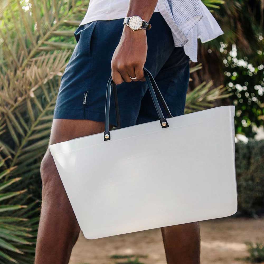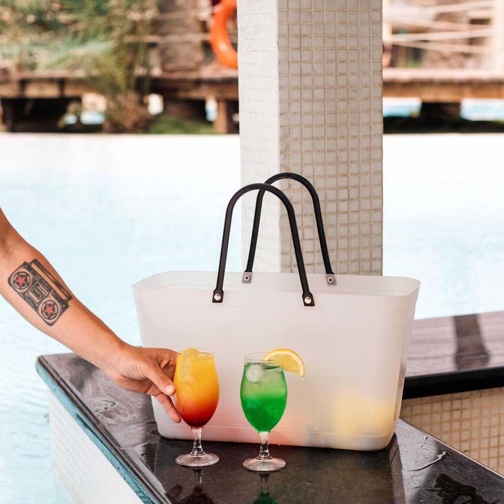 Den här Hinzaväskan är ett ännu mer klimatsmart val av väska eftersom den är tillverkad av återvunnen plast och med handtag av förnybar råvara. Självklart är väskan dessutom tillverkad i Sverige! Hinzaväskan är behagligt naturell till utseendet och semi-transparent. De matta mönsterliknande skiftningarna i ytan är egenskaper som tillkommit tack vare att materialet i väskan är återvunnet. Hinzaväskan är den ultimata varje-dag-väskan. Perfekt för picknick, träningskläder etc.Den är tålig, står stadigt och är lätt att hålla ren. Med innerväska eller överdrag som tillbehör blir väskan ännu mer användbar.