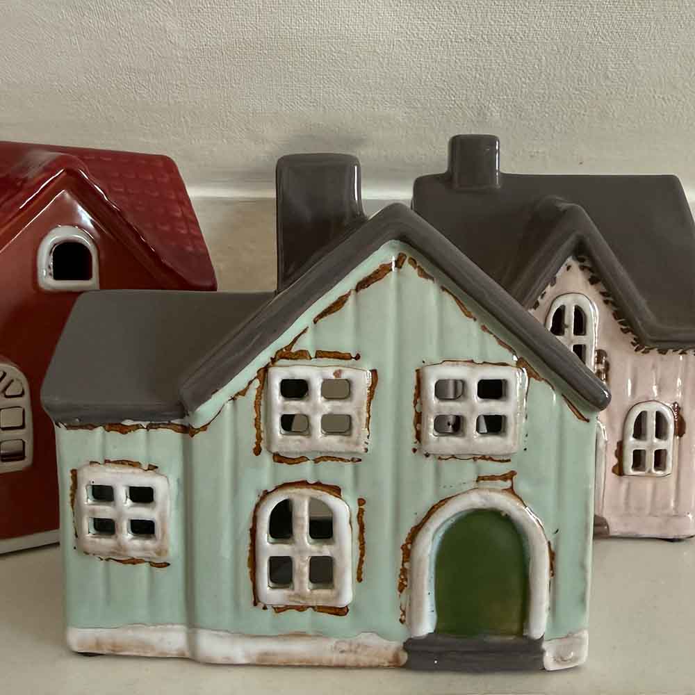 Vackert danskt keramikhus för värmeljus i blåaktig färg med grått tak att ha på en hylla eller fönsterbräda. Fint gå bort gåva eller varför inte present till dig själv? Vacker även då den inte är tänd, supermysig att ha ett ledljus eller värmeljus i om kvällarna. Vacker att kombinera med våra andra keramikhus för värmeljus. Just detta är väldigt vackert med ett målat träd på sidan.