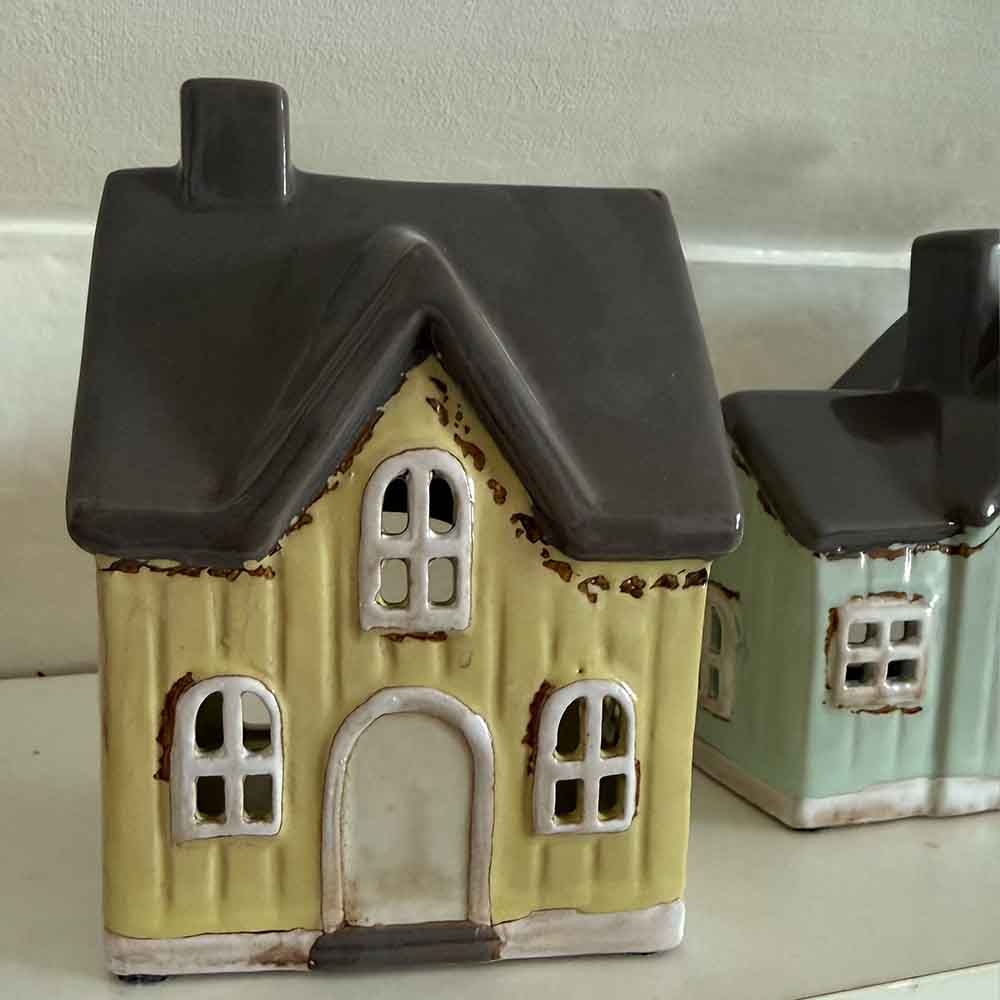Vackert danskt keramikhus för värmeljus i gult med grått tak att ha på en hylla eller fönsterbräda. Fint gå bort gåva eller varför inte present till dig själv? Vacker även då den inte är tänd, supermysig att ha ett ledljus eller värmeljus i om kvällarna. Vacker att kombinera med våra andra keramikhus för värmeljus.