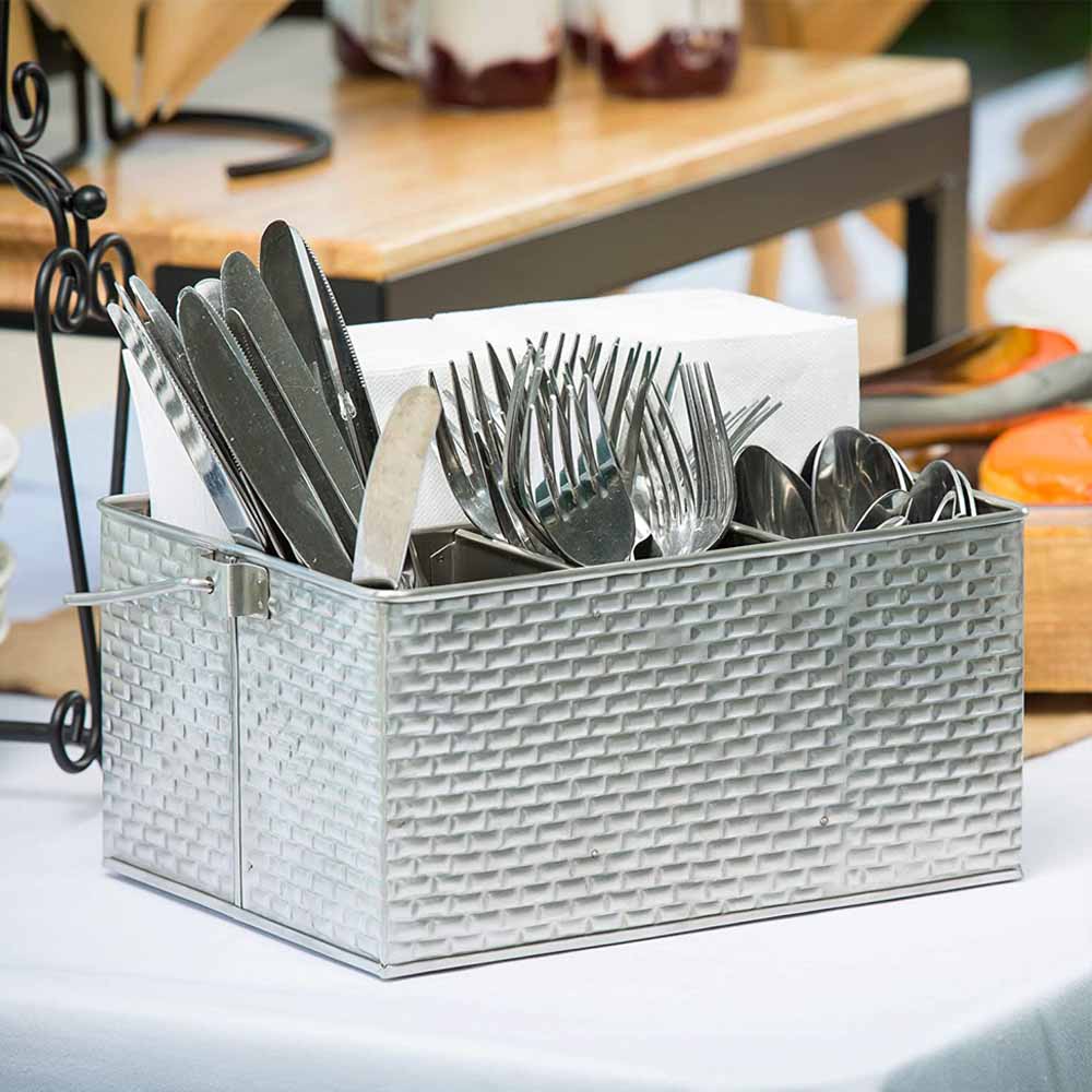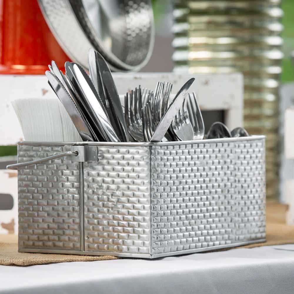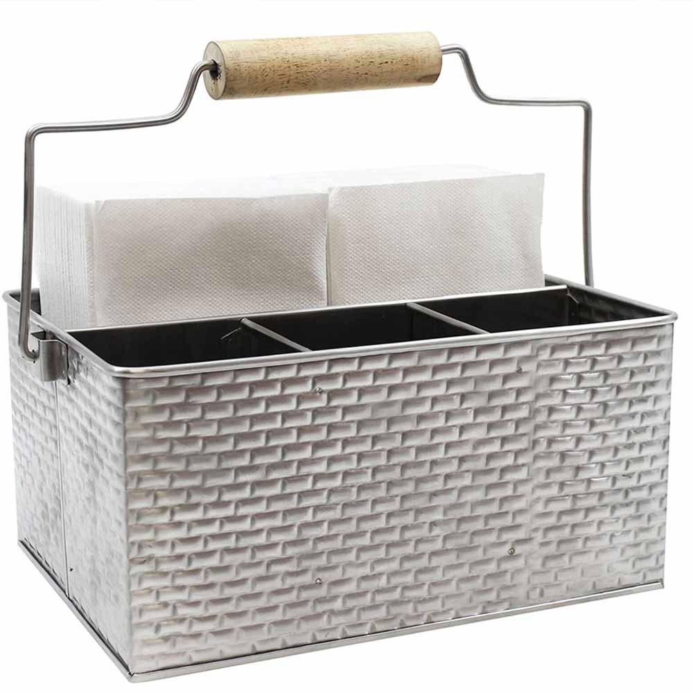 Supersmart & snygg bestickhållare att duka med på bordet eller ställa tillsammans med tallrikar för självplock. Använd bestickhållaren för servetter eller ketchup & såser längst bak, knivar, gafflar & skedar i de tre facken längst fram. Industriell stil som även passar perfekt för restauranger & caféer som dukar fram besticken / bord. Från Amerikanska Tablecraft.