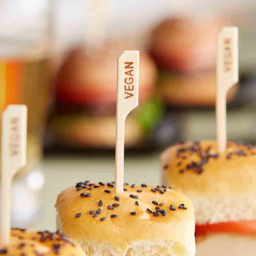 Bli sommarfestens hjälte genom att visa för dina gärster vad som är veganskt, vegetariskt och med kött med dessa praktiska matpinnar som går att återanvända många gånger. De är gjorda i bambuträ med tydlig text. Klassiska och prakiska att ha för att hålla ordning på vems hamburgare som är vems.