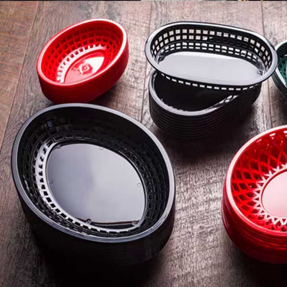 Oval dinerbasket i plast i en lite större modell. Perfekt till hamburgare, korv eller pommes frites. Skapa ditt alldeles egna diner hemma och komplettera stilen med resten av våra dinertillbehör!